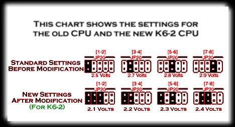 Di seguito sono riportati i voltaggi ufficiali riportati sul manuale per i processori di vecchia generazioni e i voltaggi ricavati mediante semplici modifiche per i processori di nuova generazione (K6-2).